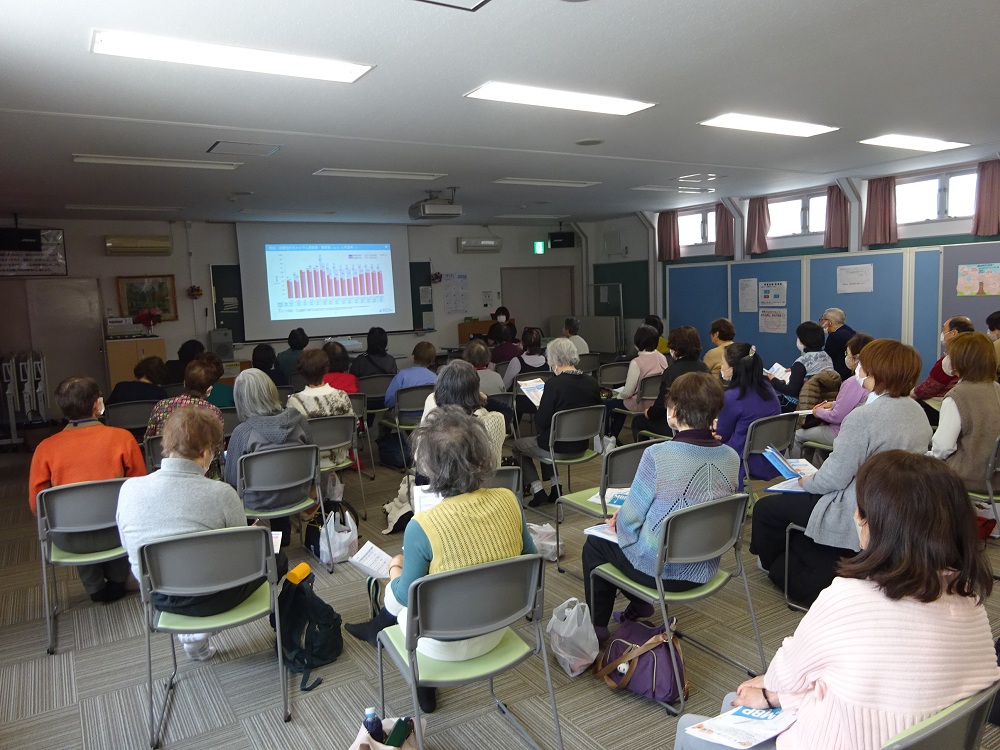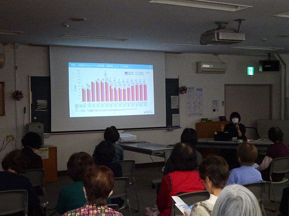 前半は、雪印メグミルクの管理栄養士 渡邊 華与子 様をお招きし 骨 カルシウムセミナーを開催しました。カルシウム自己チェック表を用いて参加者がそれぞれ日頃のカルシウム摂取状況を確認しました。