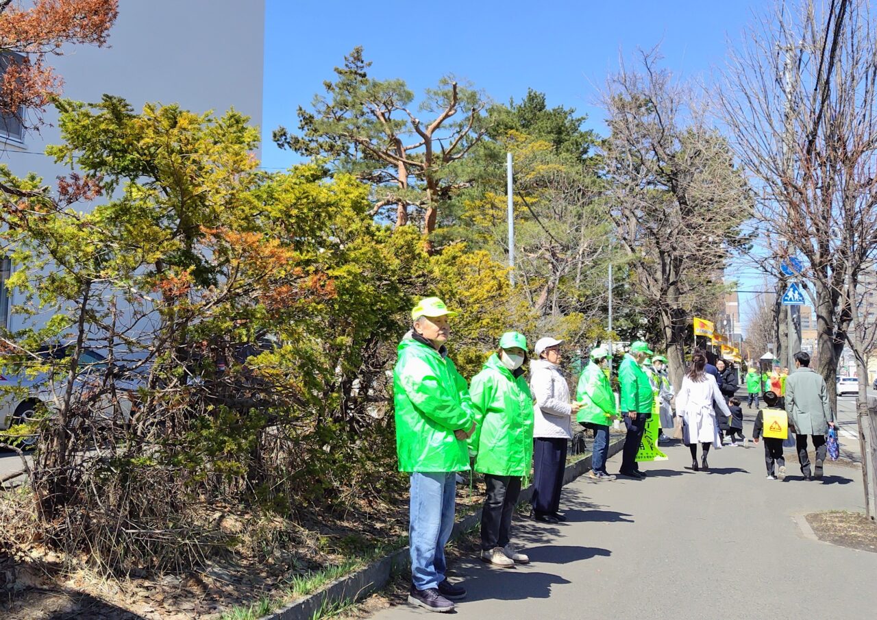 これは、全道一斉に展開される「春の交通安全市民総ぐるみ運動」に合わせて行っているもので、幌西地区交通安全実践会、交通安全指導員会、交通安全母の会の会員をはじめ、町内会役員など約50名が参加し、新入生や保護者への交通安全の呼びかけや自動車・自転車の運転者への啓発を行いました。