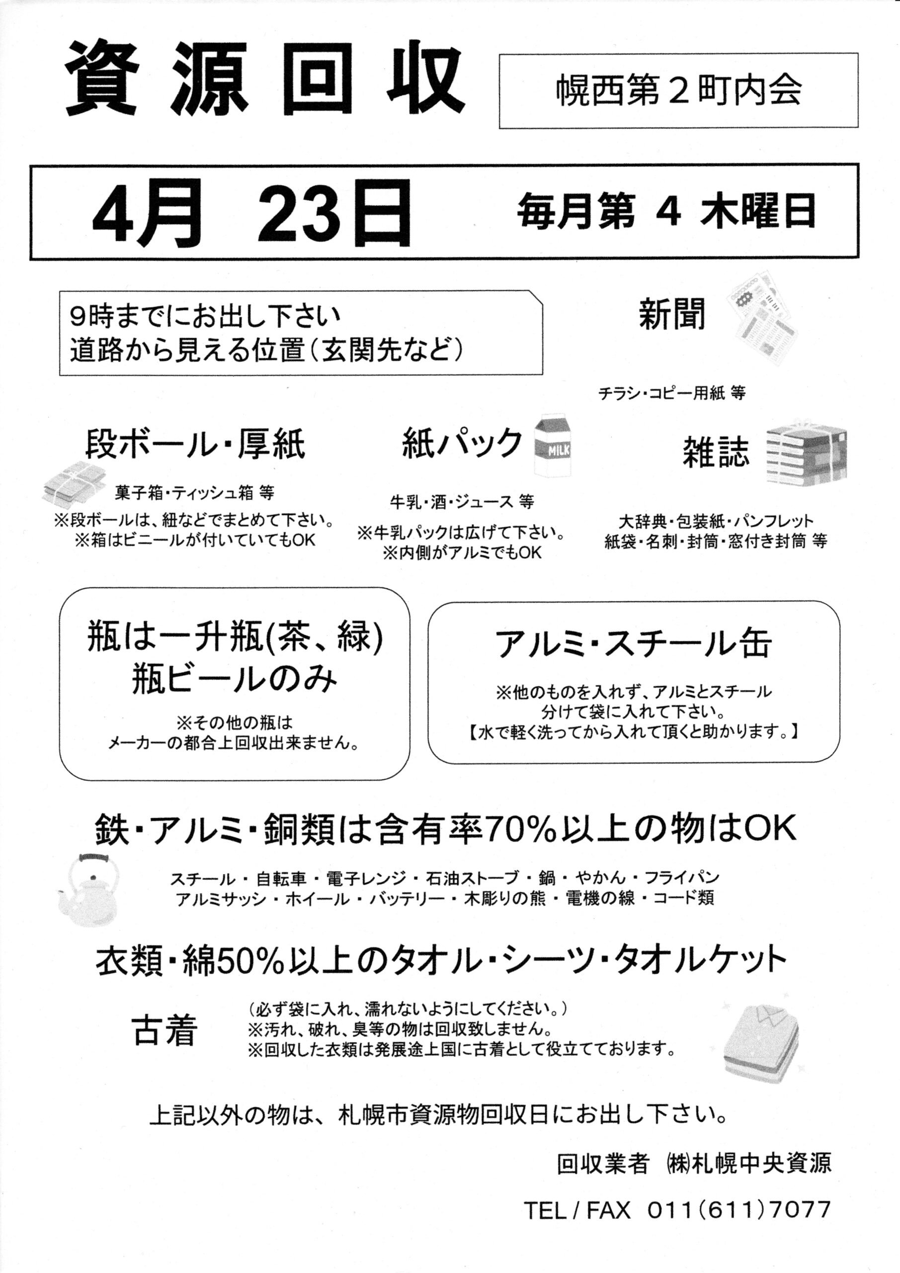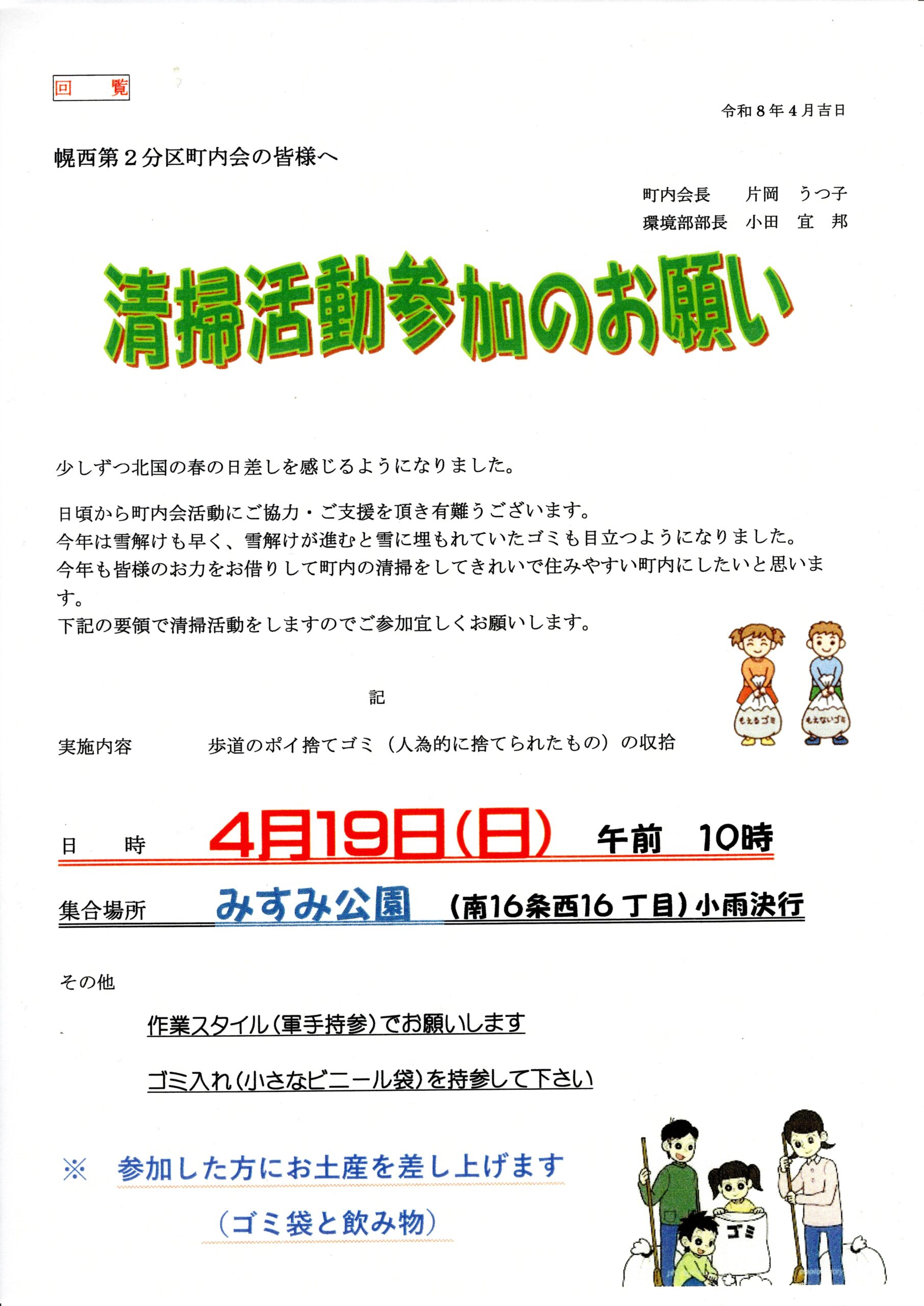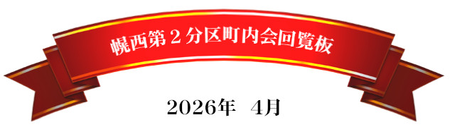 【第2分区町内会の回覧】 春の清掃活動 4月19日(日) みすみ公園(南16条西16丁目)10:00から 町内会総会 4月25日(土) 幌西会館(南13条西14丁目)10:00から 資源回収 4月23日(木) 【幌西地区連合町内会の回覧】 花苗づくり講習会 4月15日(水) 幌西会館(南11条西14丁目)14:00~15:00 ほっと 【詳細はこちら】 【その他の回覧(家庭配布版にて配布されているもの)】 こうさいじどうかいかん 【詳細はこちら(幌西児童会館HP)】 社協だより 【詳細はこちら(社会福祉協議会HP)】 ステップ 【詳細はこちら(生活就労支援センターHP)】 伏見だより(伏見小学校) ※「伏見だより」は回覧板で閲覧ください